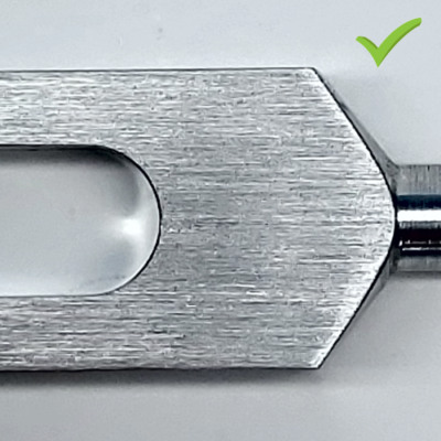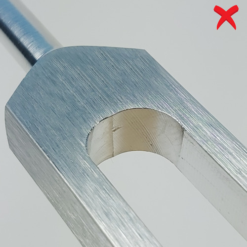 This image shows a fork that was produced by manual milling where the sequence of tool moves was not effectively executed. You can see a vertical line between two separate radii as well as tool chatter marks due to pausing of the cutting motion. These features will not influence the frequency of vibration or sustain but do indicate a lower level of quality.