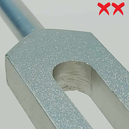 This image shows a fork that was drilled, sawn, and sanded. This method of fabrication is used by those who don’t have the appropriate machinery to produce high quality forks. These would be low cost tuning forks with equally low quality and poor performance.