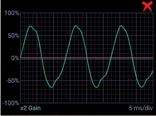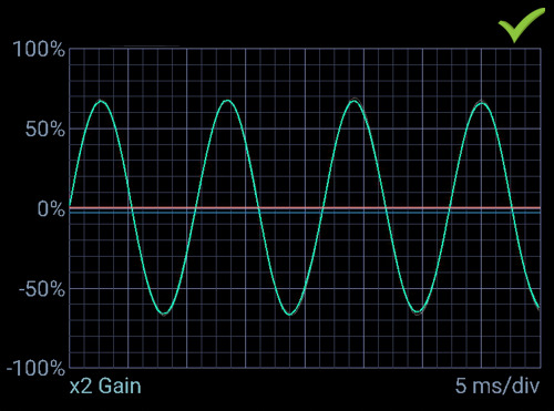 When the tine thicknesses are equal, the sine wave generated by the fork is well balanced. Note in this image the rising slope and falling slope angles are balanced. This results in good harmonics and good duration of vibration.