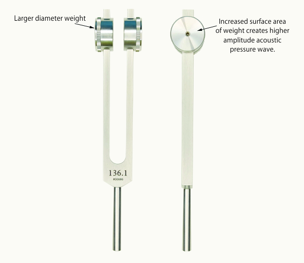 The weights of this fork are larger in diameter than what is used on the tactile fork. This creates a larger surface area in contact with the air as it is vibrating. This larger surface area results in the formation of higher amplitude pressure waves that we hear as sound.