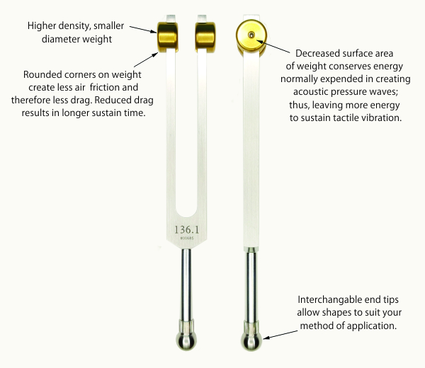 The small surface area of the weights generate lower amplitude acoustic pressure waves in the air than would a larger weight. Since less energy is expended in creating acoustic pressure waves, this energy is conserved resulting in longer sustain times for transmission of tactile vibration through the stem of the fork.